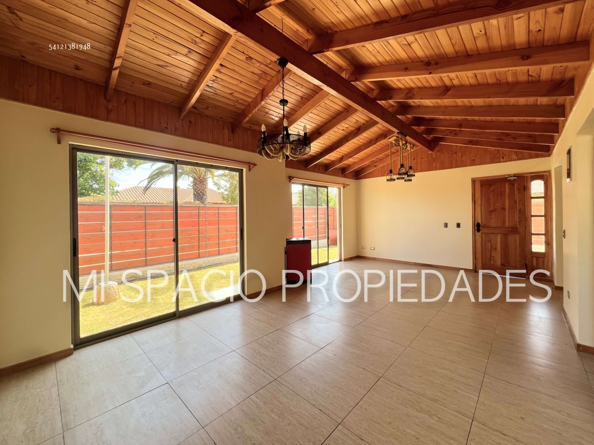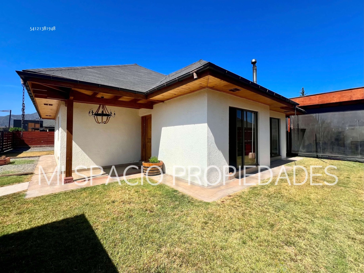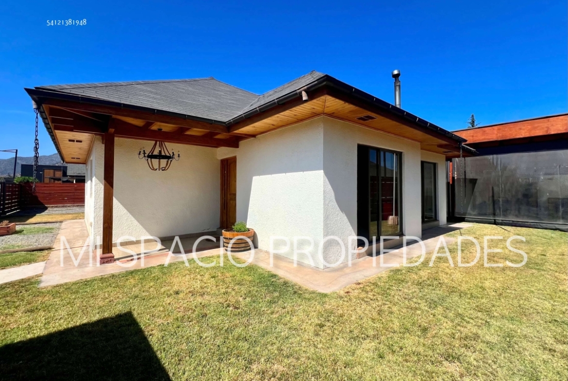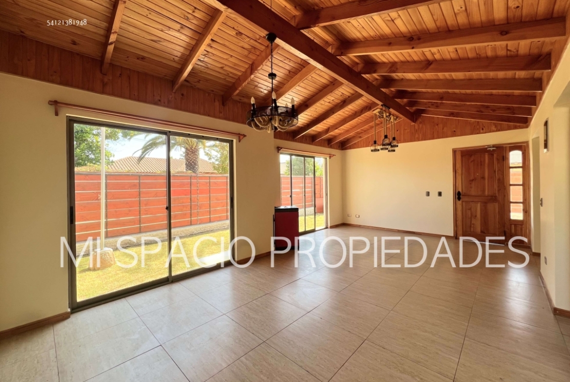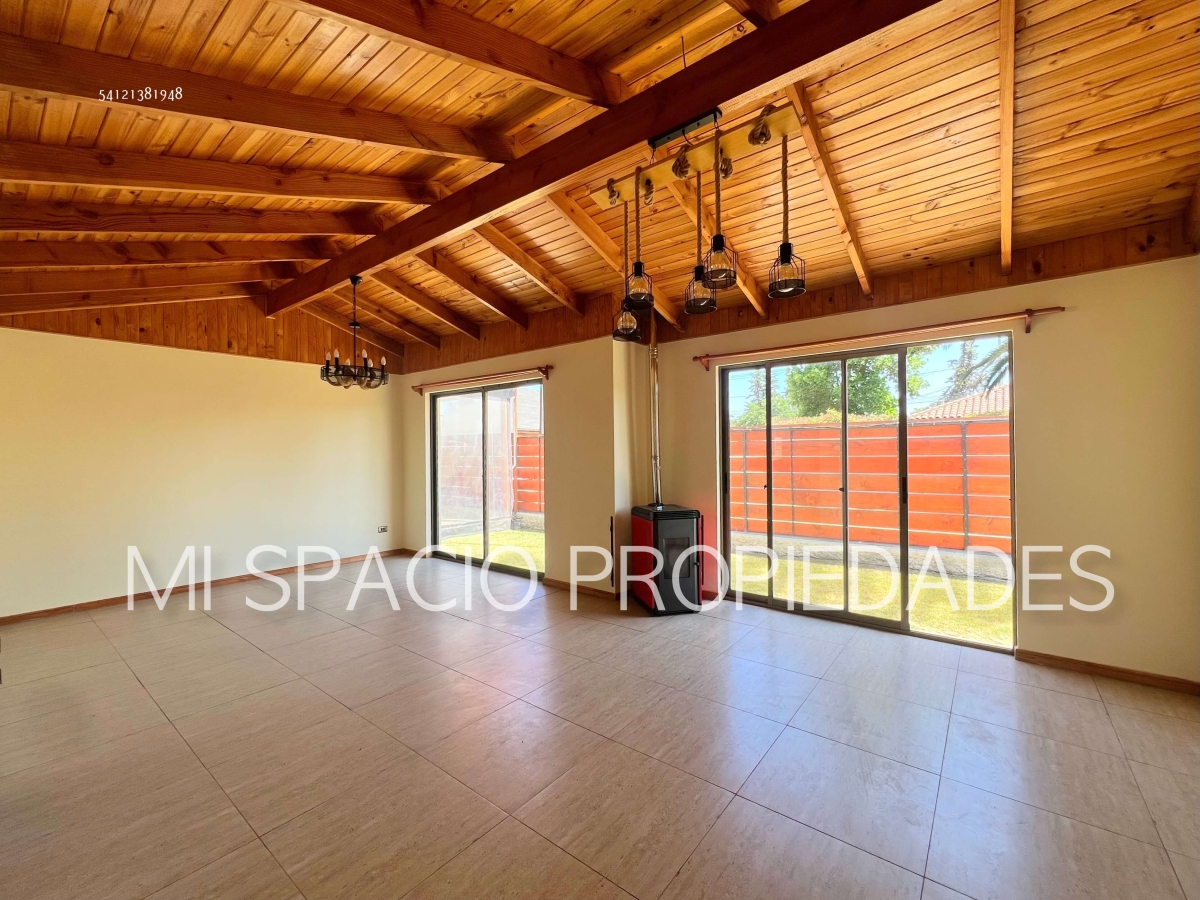 Amplio y luminoso living comedor  de cielos de doble aguas y vigas a la vista, estufa a pellet, cocina amoblada y equipada con acceso a patio posterior. 2 amplios dormitorios con closet, 1 baño completo con ducha en obra, dormitorio principal con closet y baño en suite. Estacionamiento techado para 2 autos con preciosos cielos en madera y bodega, zona de juegos de niños, terraza en deck con toldo, lavadero exterior, amplio quincho con asadera en obra, horno y lavacopas, cierre en persianas panorámicas, segundo estacionamiento o sala multiuso con bodega y baño. Jardín con pozo propio para riego, agua potable, gas por balones, fosa particular, cierre perimetral dos portones automáticos para entrada vehicular, puerta peatonal, espacio para estacionamiento de visitas. Ubicada en condominio cerrado, acceso controlado, urbanización subterránea, rodeado de vecinos en zona residencial de rápido acceso, bajos gastos comunes. Disponible. Requisitos acreditar ingreso familiares por $4.000.000 adecuados informes comerciales y codeudor.