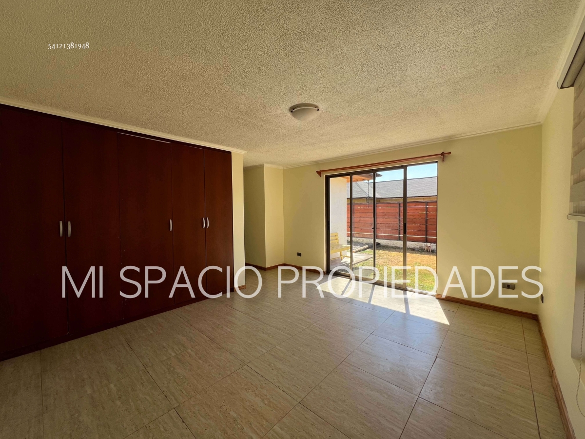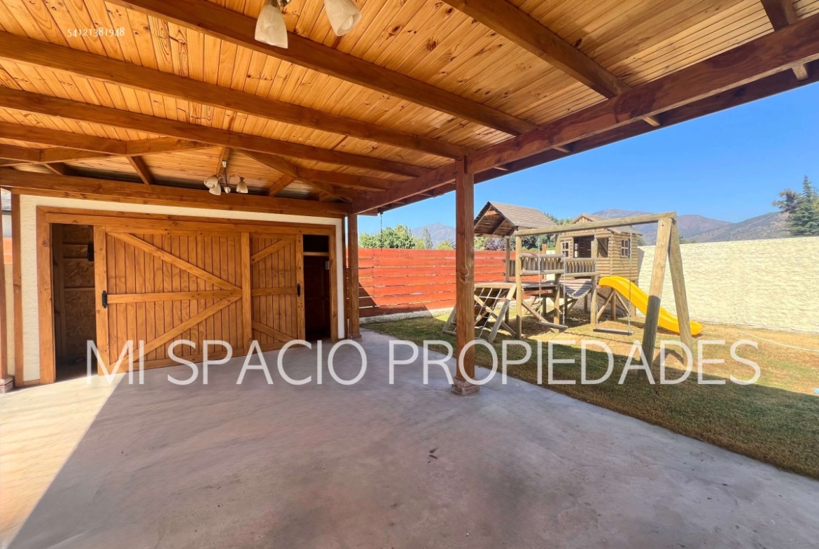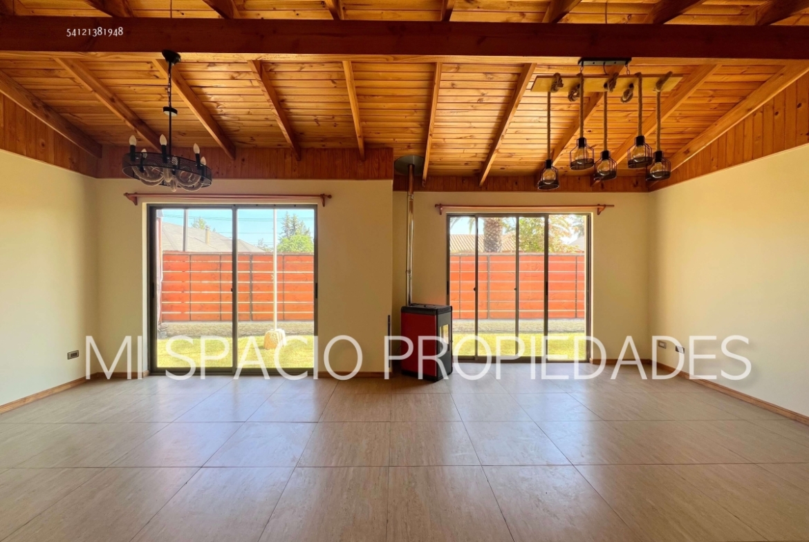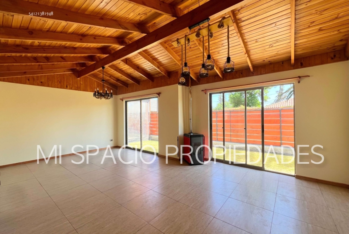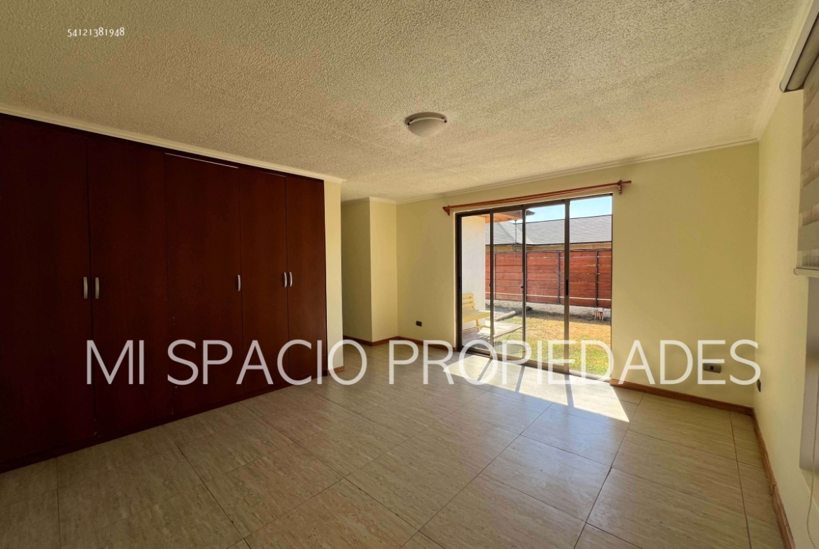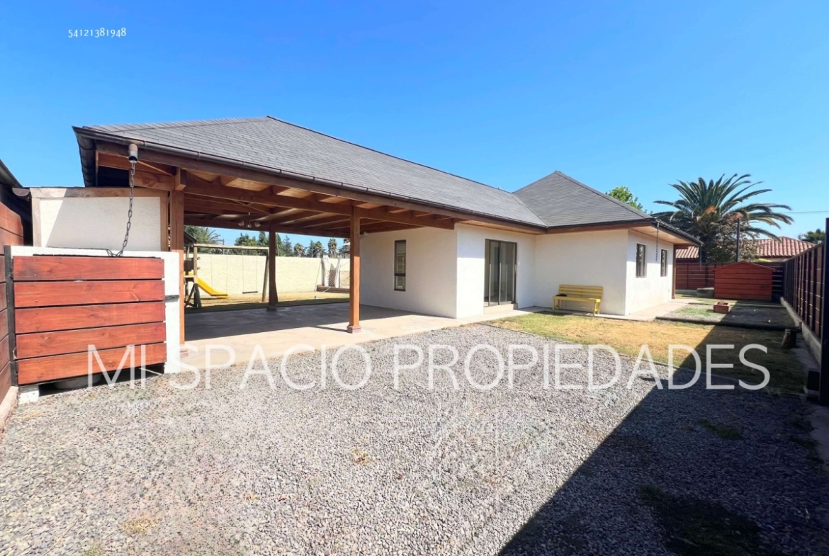 Amplio y luminoso living comedor  de cielos de doble aguas y vigas a la vista, estufa a pellet, cocina amoblada y equipada con acceso a patio posterior. 2 amplios dormitorios con closet, 1 baño completo con ducha en obra, dormitorio principal con closet y baño en suite. Estacionamiento techado para 2 autos con preciosos cielos en madera y bodega, zona de juegos de niños, terraza en deck con toldo, lavadero exterior, amplio quincho con asadera en obra, horno y lavacopas, cierre en persianas panorámicas, segundo estacionamiento o sala multiuso con bodega y baño. Jardín con pozo propio para riego, agua potable, gas por balones, fosa particular, cierre perimetral dos portones automáticos para entrada vehicular, puerta peatonal, espacio para estacionamiento de visitas. Ubicada en condominio cerrado, acceso controlado, urbanización subterránea, rodeado de vecinos en zona residencial de rápido acceso, bajos gastos comunes. Disponible. Requisitos acreditar ingreso familiares por $4.000.000 adecuados informes comerciales y codeudor.