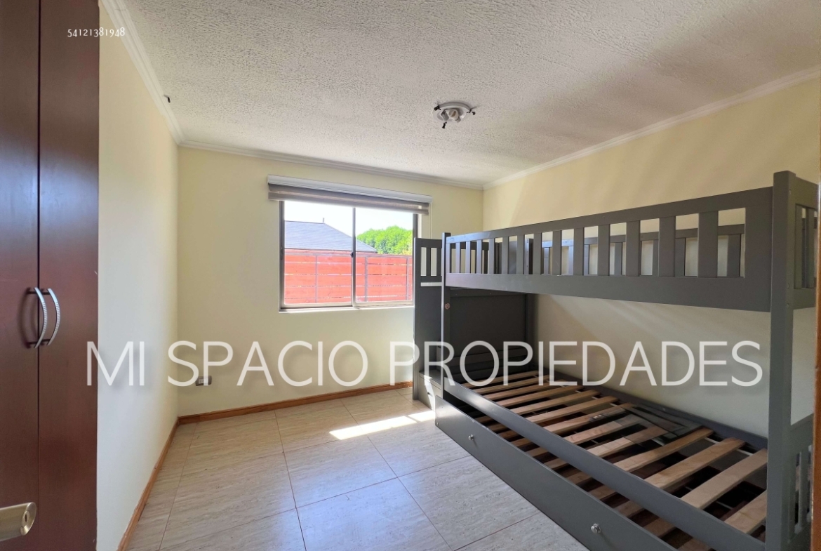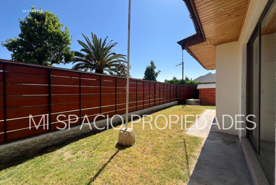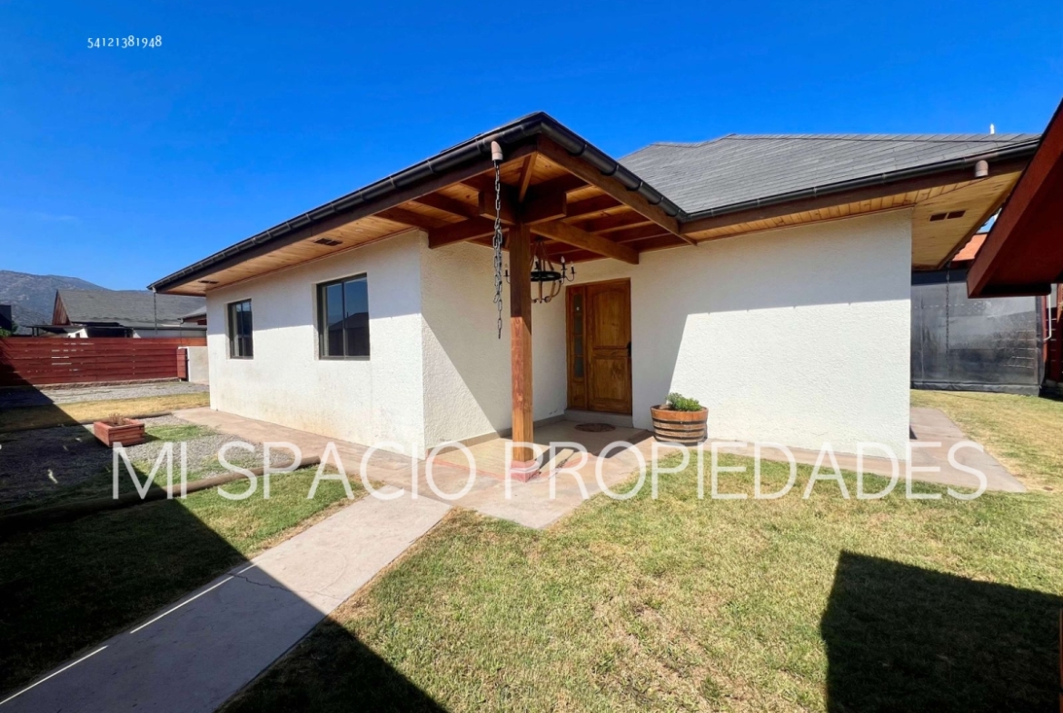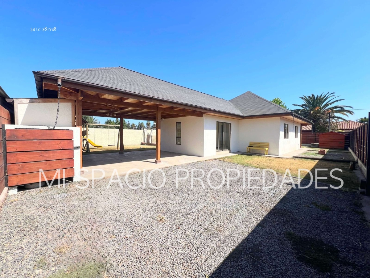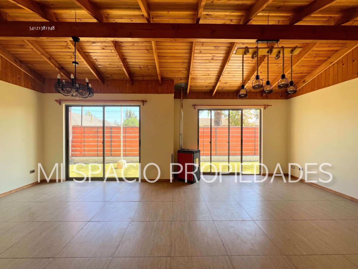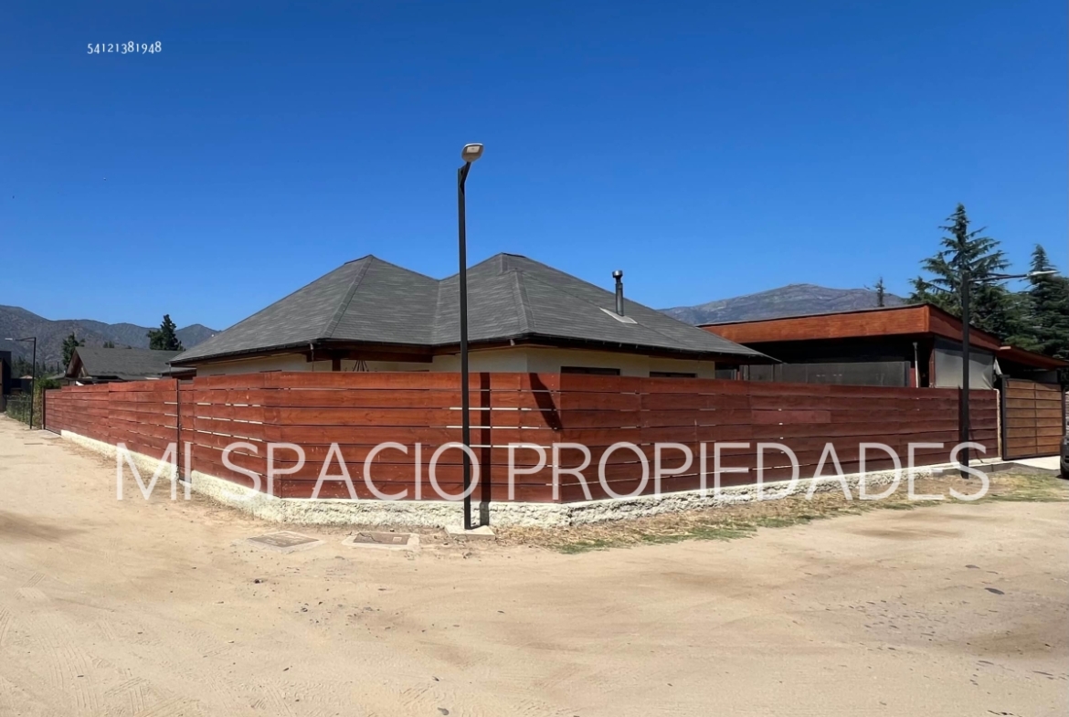 Amplio y luminoso living comedor  de cielos de doble aguas y vigas a la vista, estufa a pellet, cocina amoblada y equipada con acceso a patio posterior. 2 amplios dormitorios con closet, 1 baño completo con ducha en obra, dormitorio principal con closet y baño en suite. Estacionamiento techado para 2 autos con preciosos cielos en madera y bodega, zona de juegos de niños, terraza en deck con toldo, lavadero exterior, amplio quincho con asadera en obra, horno y lavacopas, cierre en persianas panorámicas, segundo estacionamiento o sala multiuso con bodega y baño. Jardín con pozo propio para riego, agua potable, gas por balones, fosa particular, cierre perimetral dos portones automáticos para entrada vehicular, puerta peatonal, espacio para estacionamiento de visitas. Ubicada en condominio cerrado, acceso controlado, urbanización subterránea, rodeado de vecinos en zona residencial de rápido acceso, bajos gastos comunes. Disponible. Requisitos acreditar ingreso familiares por $4.000.000 adecuados informes comerciales y codeudor.