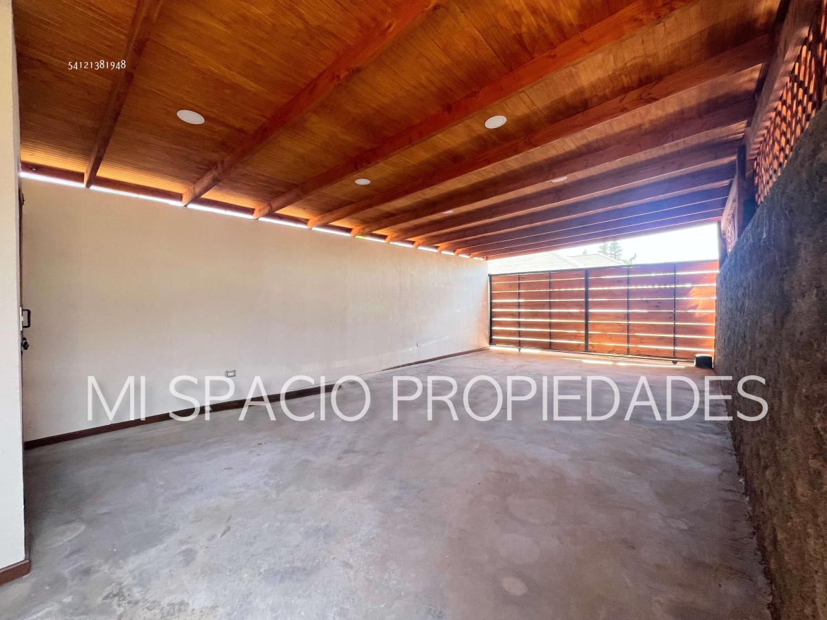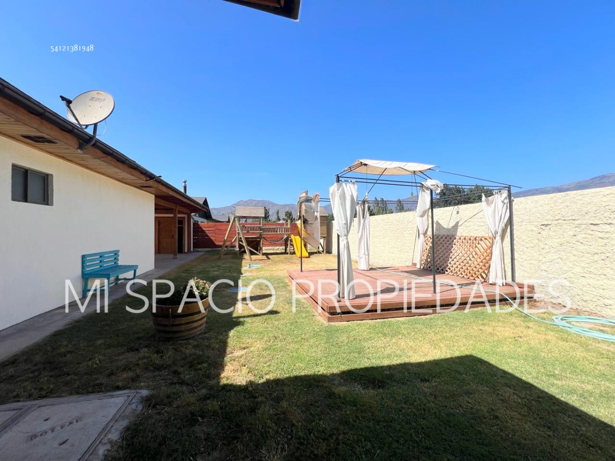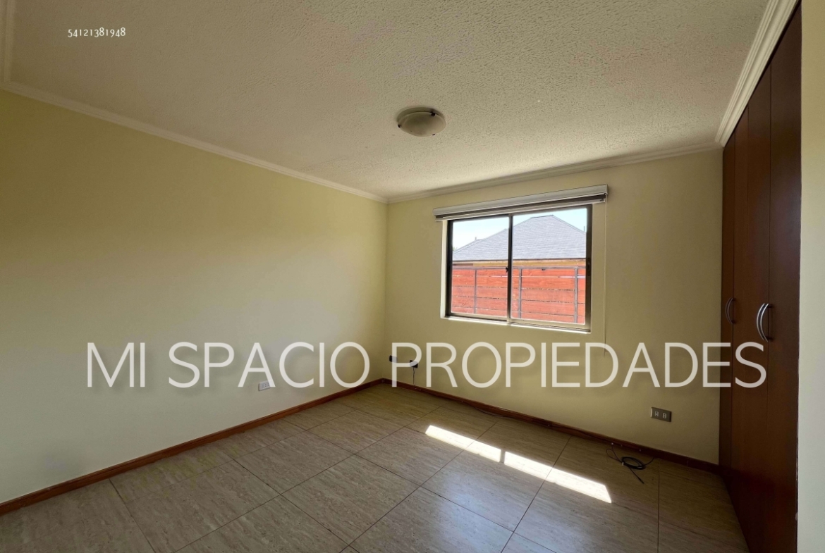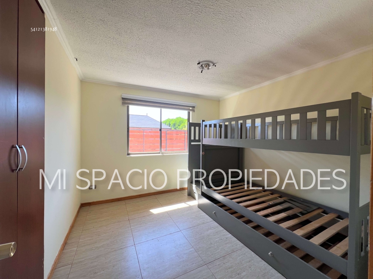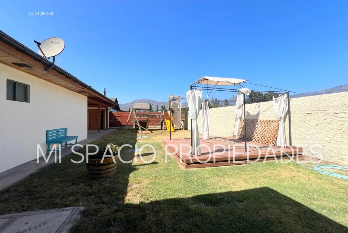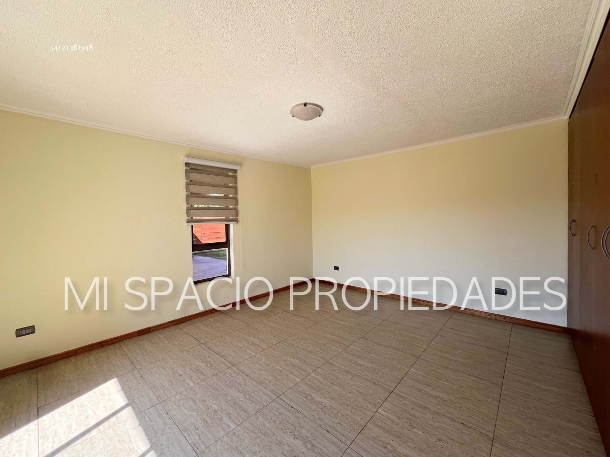 Amplio y luminoso living comedor  de cielos de doble aguas y vigas a la vista, estufa a pellet, cocina amoblada y equipada con acceso a patio posterior. 2 amplios dormitorios con closet, 1 baño completo con ducha en obra, dormitorio principal con closet y baño en suite. Estacionamiento techado para 2 autos con preciosos cielos en madera y bodega, zona de juegos de niños, terraza en deck con toldo, lavadero exterior, amplio quincho con asadera en obra, horno y lavacopas, cierre en persianas panorámicas, segundo estacionamiento o sala multiuso con bodega y baño. Jardín con pozo propio para riego, agua potable, gas por balones, fosa particular, cierre perimetral dos portones automáticos para entrada vehicular, puerta peatonal, espacio para estacionamiento de visitas. Ubicada en condominio cerrado, acceso controlado, urbanización subterránea, rodeado de vecinos en zona residencial de rápido acceso, bajos gastos comunes. Disponible. Requisitos acreditar ingreso familiares por $4.000.000 adecuados informes comerciales y codeudor.