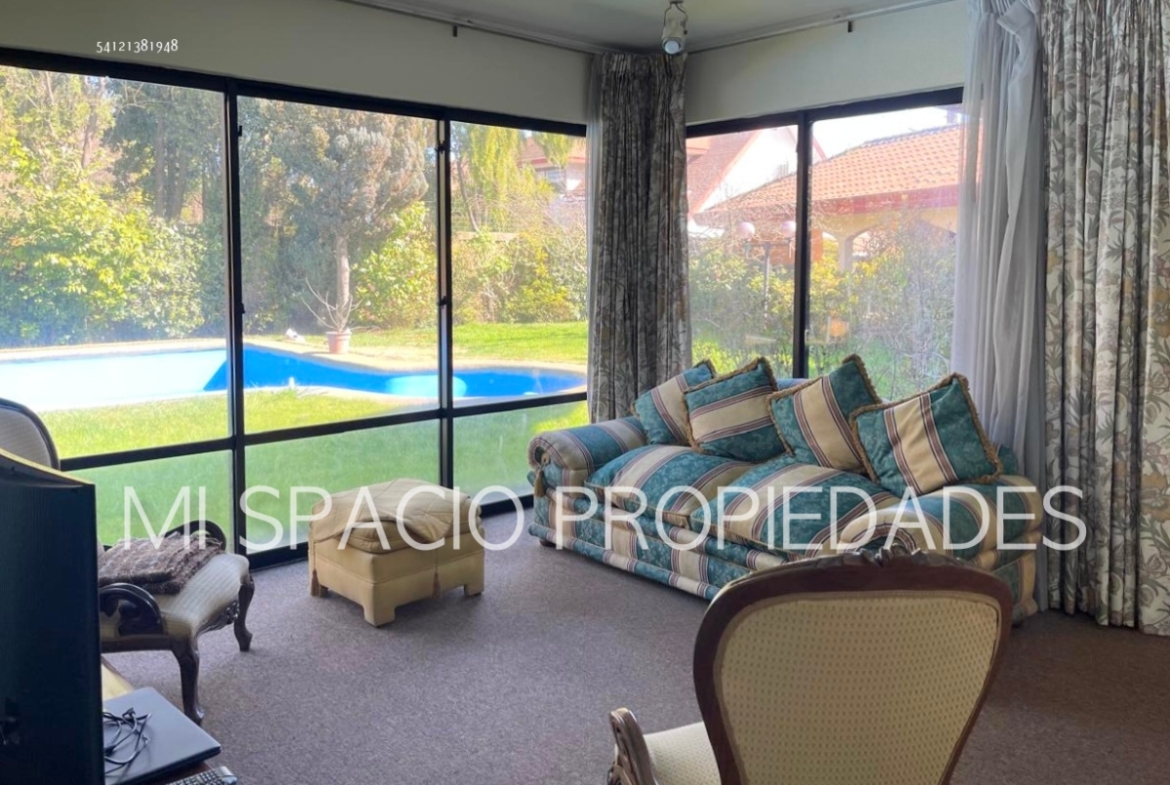 Jardín formado, piscina, riego, pozo propio y factibilidad agua potable, calefacción central por losa y radiadores, estacionamientos techados para 3 autos, cerco eléctrico. Ubicada sobre calle El Granero y La Espiga ( terreno esquina) y en sector residencial de alta demanda, estructurado por las avenidas Vicente Méndez y Paul Harris, cercano a principales colegios, supermercados, centros deportivos y equipamiento en general. Recepción final otorgada.